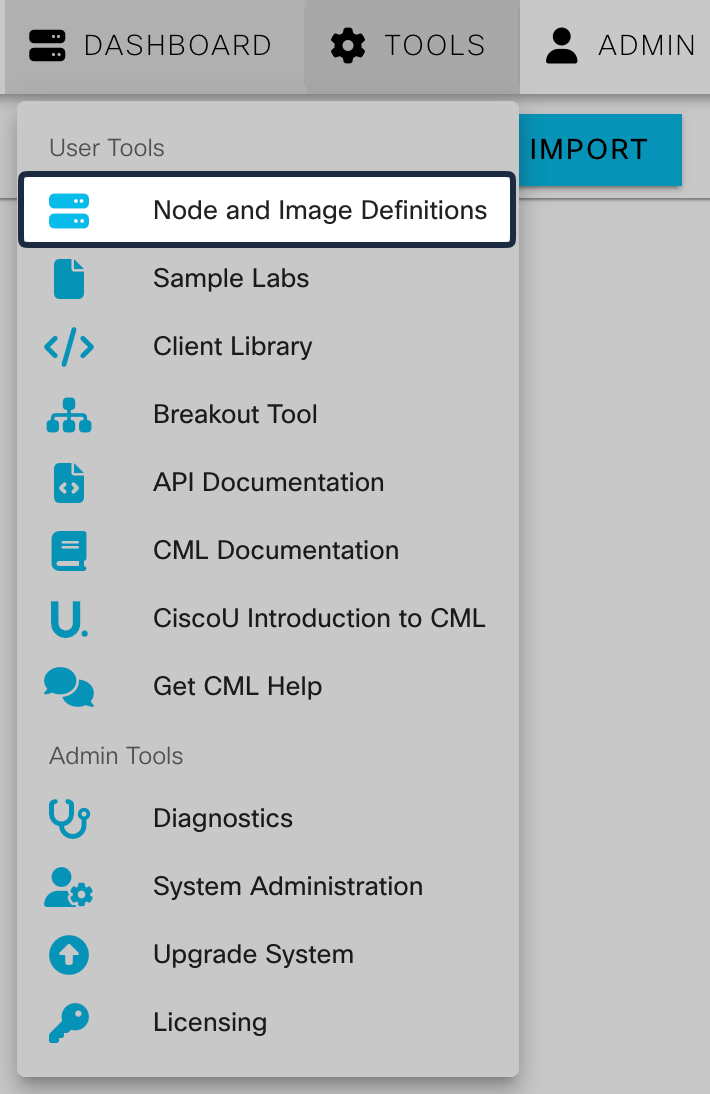 Log in to the CML web server and navigate to Tools > Node and Image Definitions > Import