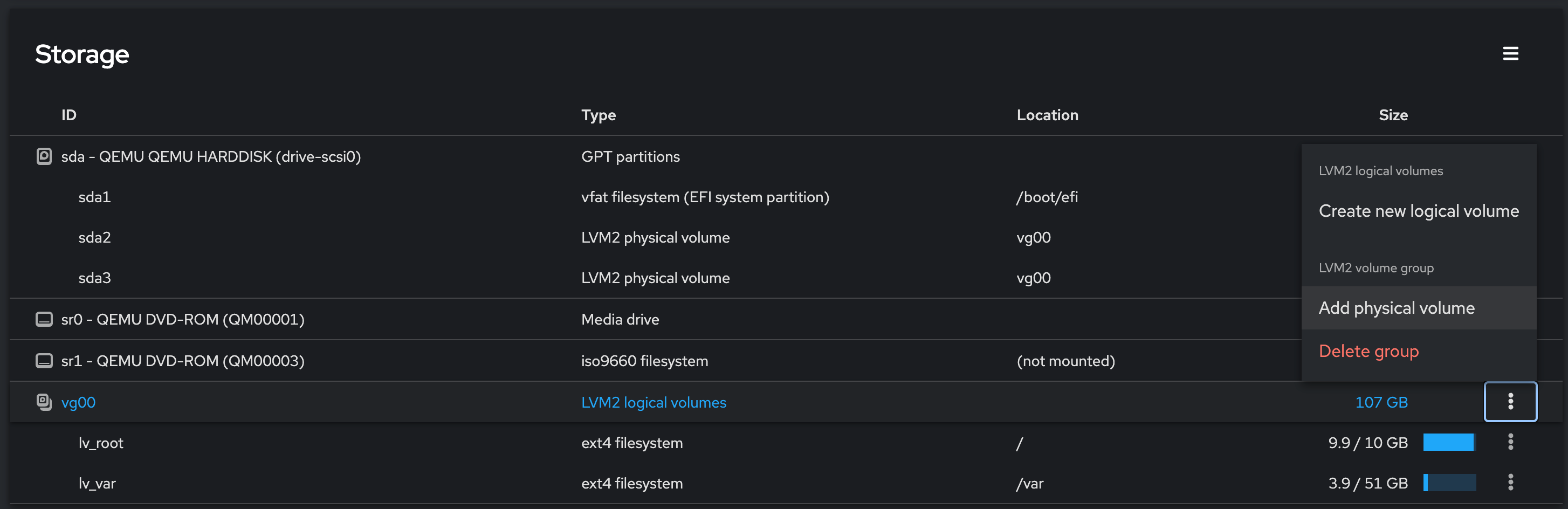 After the disk has been added within Cockpit you’ll need to extend the previously mentioned partition in order to increase the disk space on our mounted ‘/’ partition. At the far button section there’s a vg00 section and the top entry should be the lv_root which the smart reader will also notice was present in our previous commands within the SSH session.