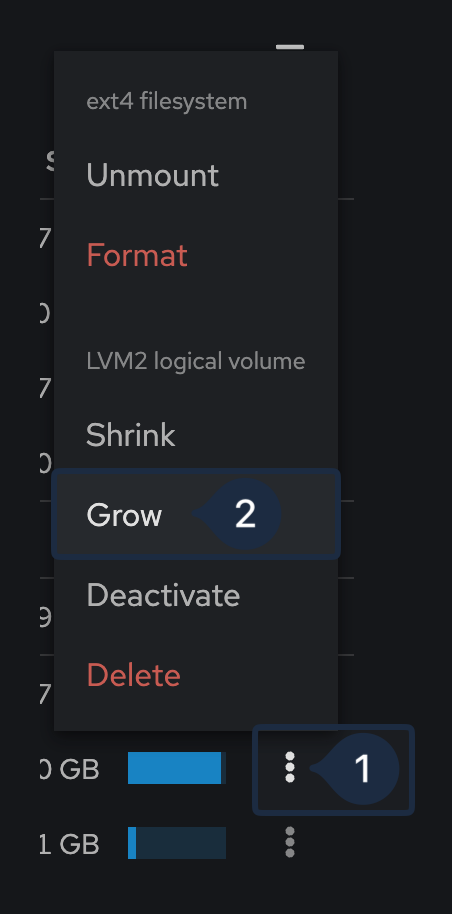 Pressing the three dots on the far right, gives us the option to Grow (Grow, increase, extend - many names for the same thing), depending on your added disk and needs you specify how amount of that disk you want to allocate to this partition.
