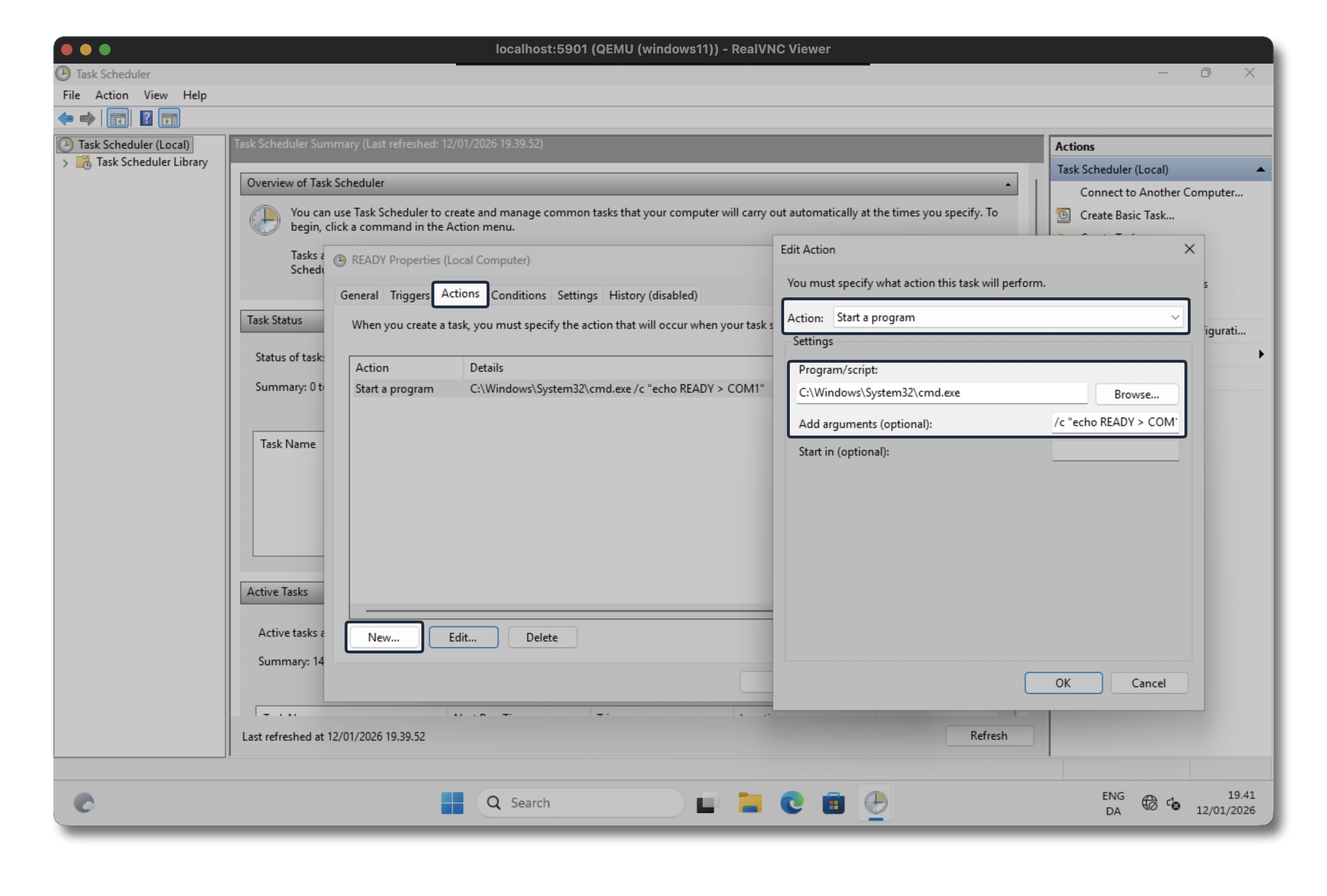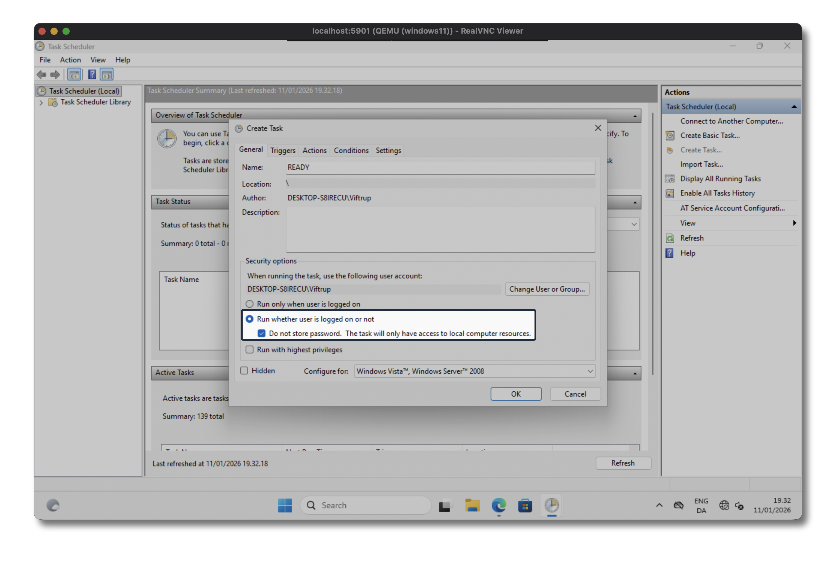 Start the Task Scheduler and create a new task on the far right side navigation pane. I’ve named it READY and be sure to select the cron should to Run whenever user is logged on or not otherwise the check will only succeed once you’ve logged into the Windows machine.