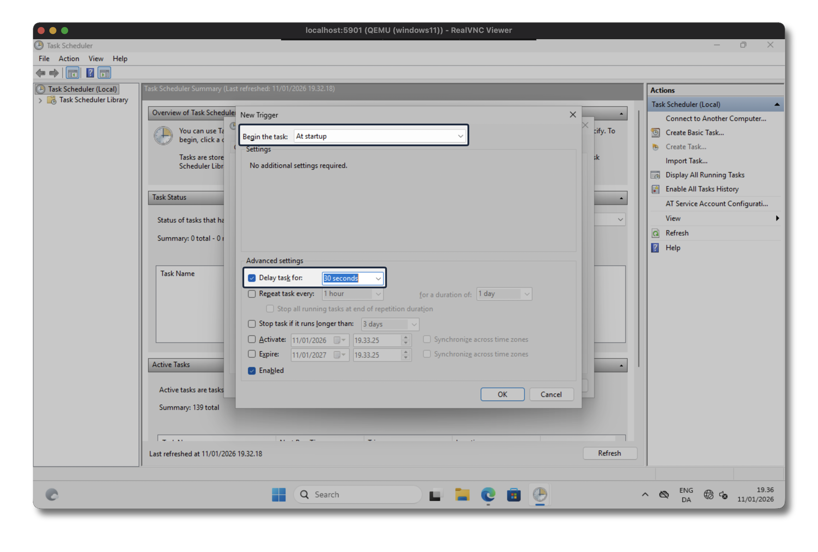 At the Advanced Setting section tick the Delay task for radiobox and specify 30 seconds - you can tinker with the delay duration, I’ve chosen 30 seconds just to be sure, lower value should also work.